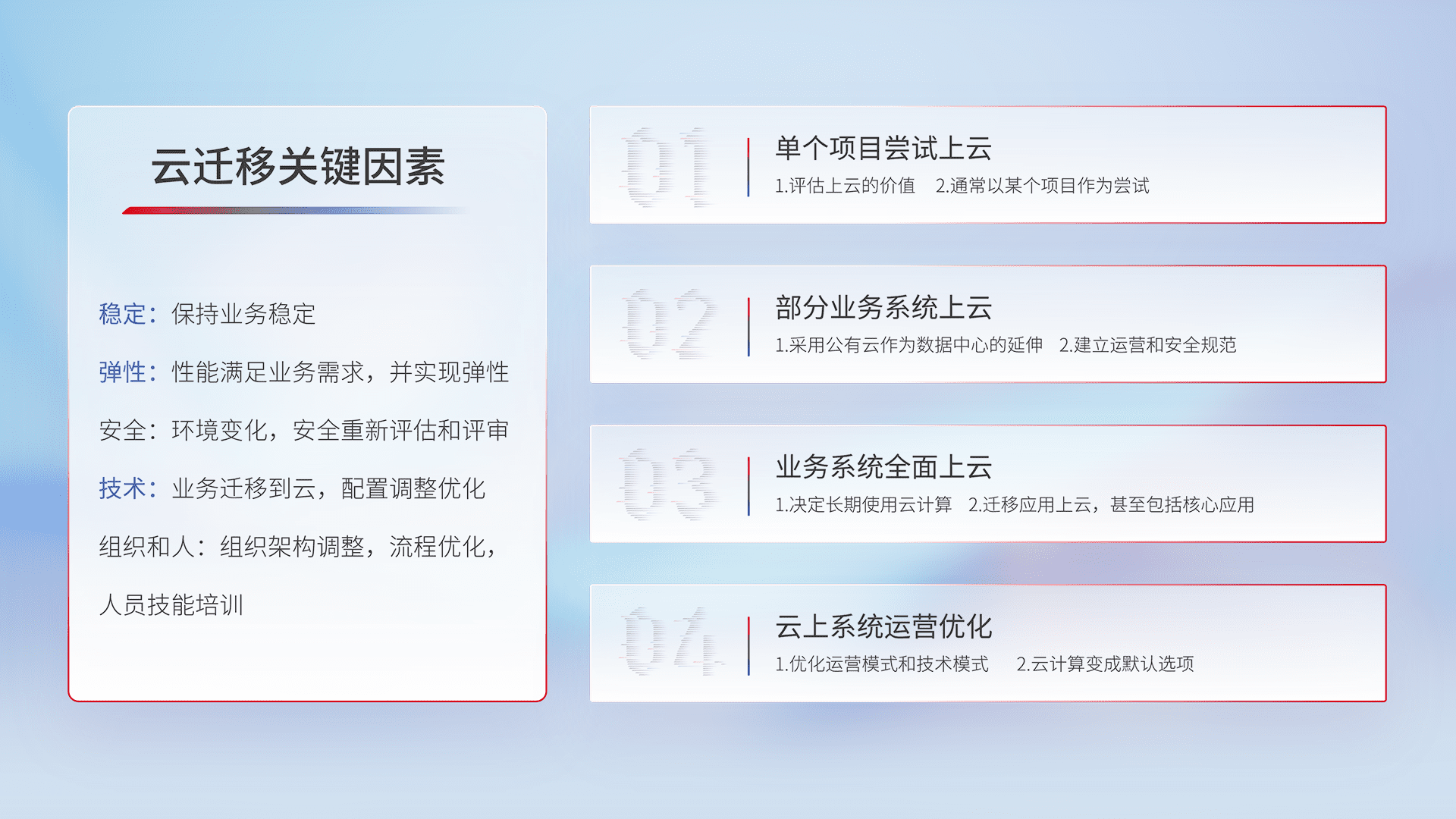 结合实际业务,,,从规划设计、、云平台选型、、、、云原生改造、、、数据迁移、、、、集成交付,,迁移全过程为客户识别最佳上云路径,,,做好风险识别管理,,设计网络架构、、、身份权限、、、安全审计合规、、操作审计、、日志审计、、、、监控告警策略、、、多站点容灾设计等,,,对云上基础设施进行整体规划,,,,提升IT治理水平,,以满足弹性、、高可用、、、高性能的需求。。