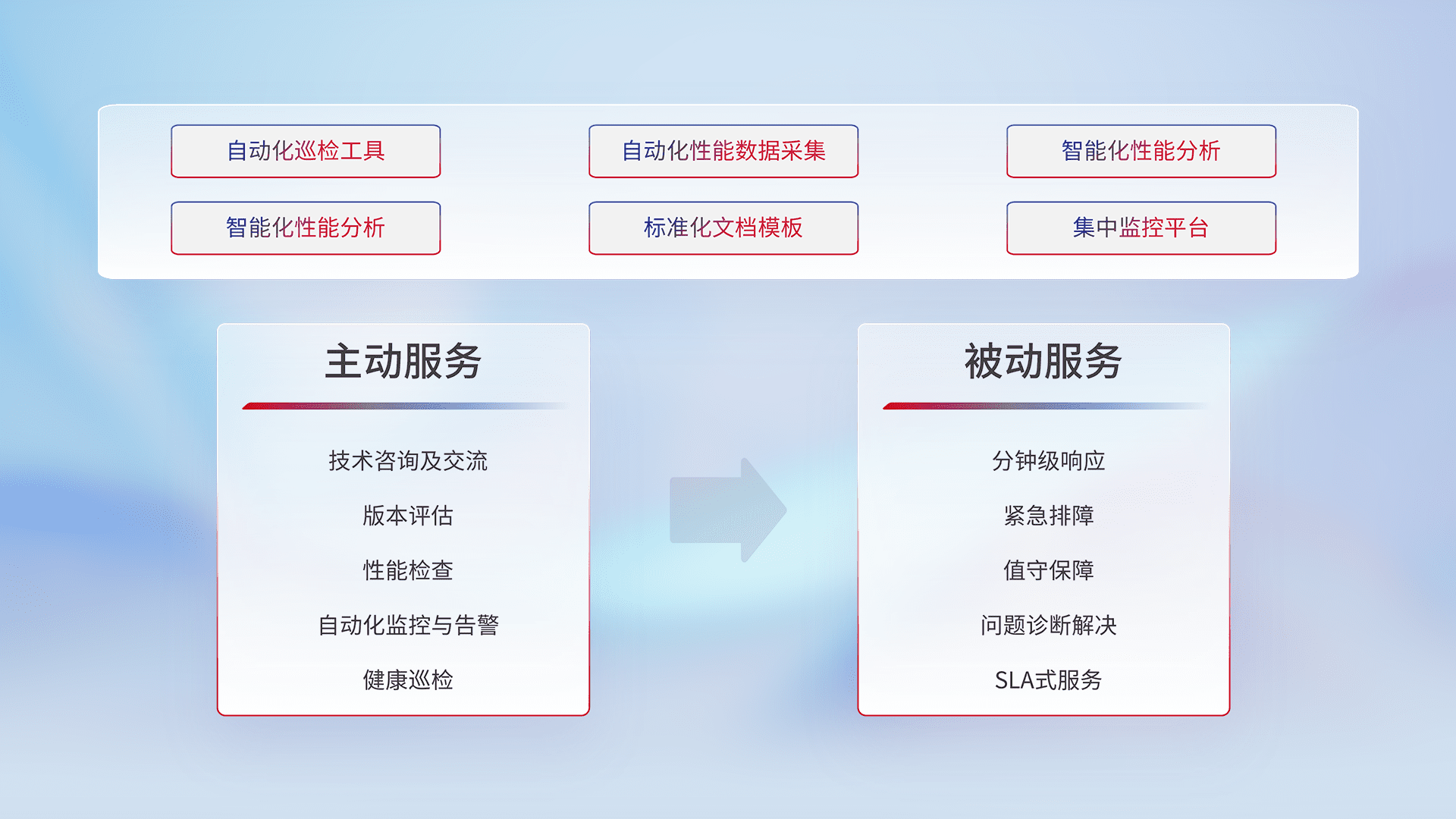 智能化工具和标准化文档,,保障服务质量,,提供主动服务(包含技术咨询、、、版本评估、、、、性能检查、、、自动化监控与告警、、健康巡检)和被动服务包含(分钟级响应、、、、紧急排障、、、、值守保障、、、、问题诊断解决、、、、SLA服务)。。