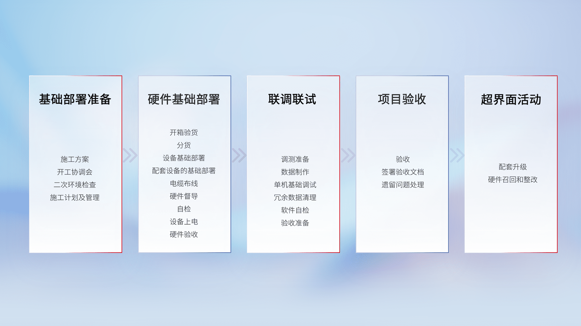 从基础部署准备、、硬件基础部署、、联调联试、、项目验收、、越界面活动的全过程可追溯,,,,保证施工质量和进度。。